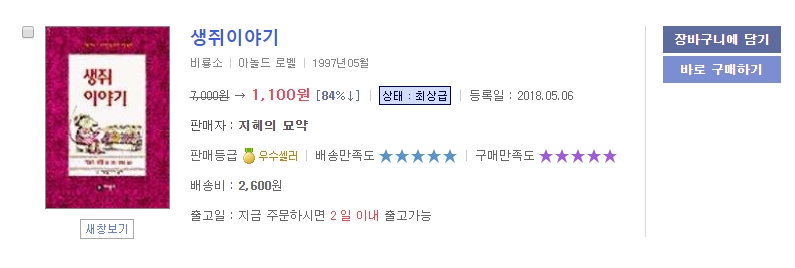 검색해보니 역시 착한가격에 검색이 되네요.. 상태도 최상급인데 할인율이 무려 84%나 되네요. 커피한잔값도 안나오는 1,100원 입니다.
