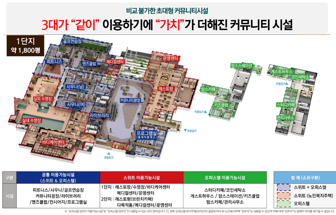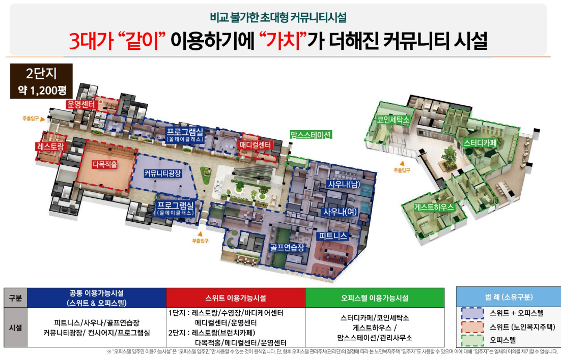만 60세 이상만 입주 가능한 호텔식 실버타운인 ‘스위트’(전용 61㎡, 84㎡, 임대주택 총 536세대)와 분양형 하이엔드 오피스텔(전용 99㎡, 119㎡, 총 842실)이 복합 개발되는 세대공존형 대규모 주거단지로 조성되는 것이 특징이다.
