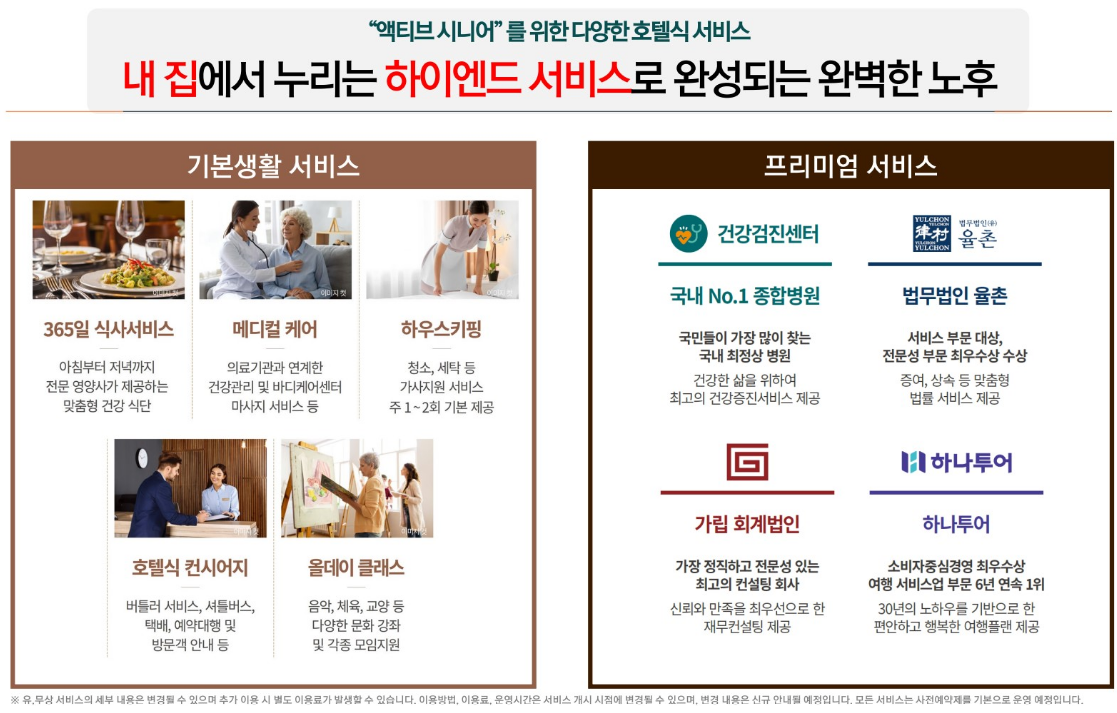여기에 단지는 다양한 프로그램과 부대시설을 도입해 풍요롭고 여유로운 노후 생활을 누릴 수 있게 했다. 먼저 이곳에서는 전담 영양사가 준비하는 건강식 식사를 먹고, 청소와 분리수거를 책임지는 하우스키핑, 각종 스케줄 예약 등 비서 역할을 하는 컨시어지 서비스 등을 누리며 일과 가사노동으로부터 완벽한 해방을 꿈꿀 수 있다.