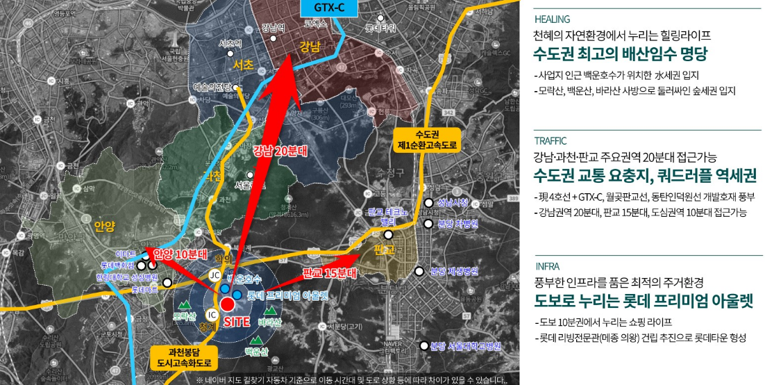 또 강남 등 주요 도시로의 접근성도 탁월하다. 바로 옆에는 청계IC가 위치해 과천봉담도시고속화도로 및 수도권 제1순환고속도로를 통해 강남권 20분대 접근이 가능하며, 분당 및 판교, 과천, 안양 등 주변도시도 10분대면 접근할 수 있다.